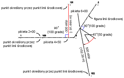 Punkt 100 znajduje się przy pikiecie 200, a odsunięcie wynosi zero. Punkt 101 znajduje się przy pikiecie 450, a odsunięcie w lewo wynosi 91.44. Punkt 102 znajduje się przy pikiecie 600, odsunięcie w prawo wynosi 152.4 a kąt skosu 50.