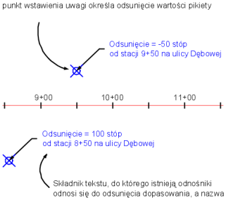 Na podstawie punktu wstawienia etykiety Uwaga można identyfikować dane zależne od położenia tekstu wskazywanego przez odniesienia. Na przykład na poniższym rysunku punkt wstawienia określa pikietę i wartości odsunięcia, które pojawiają się w etykiecie.