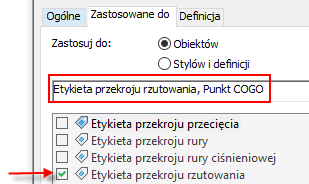 Aby dołączyć dane zestawu właściwości w stylach etykiet rzutowania, należy wybrać typ obiektu Etykieta przekroju rzutowania oprócz typu obiektu, którego rzutowanie pokazane jest w widoku przekroju.