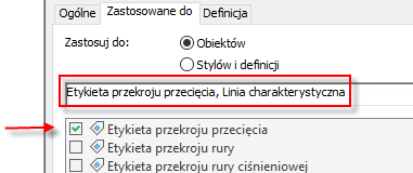 Aby dołączyć dane zestawu właściwości w stylach etykiet przecięć, należy wybrać typ obiektu Etykieta przekroju przecięcia oprócz typu obiektu, którego położenie przecięcia pokazane jest w widoku przekroju.