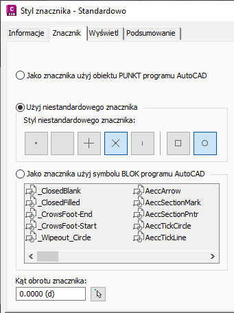 Style znacznika można skonfigurować w taki sposób, aby używać punktów programu AutoCAD, niestandardowych symboli znacznika lub bloków.