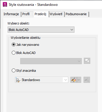Obiekty rzutowane w widokach przekroju wykorzystują następujące style: