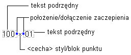Styl etykiety rzędnej punktu jest konfigurowany w Edytorze stylów etykiet. Podczas tworzenia rzędnej punktu polecenie może zdefiniować styl istniejącego punktu i etykiety lub też może zostać określony blok w strukturze stylu etykiety rzędnej punktu.