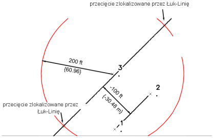 Punkty przecięcia znajdują się pomiędzy łukiem o promieniu 200 i środku w punkcie 3 a linią poprowadzoną pomiędzy punktem 1 i 2 przy odległości odsunięcia 100 w lewo.