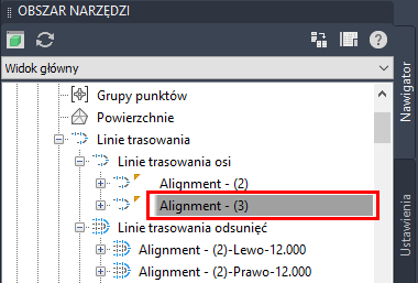 Linie trasowania osi jezdni w drzewie Nawigatora. To polecenie umożliwia szybkie znalezienie położenia przecinającej się linii trasowania w drzewie Nawigatora.