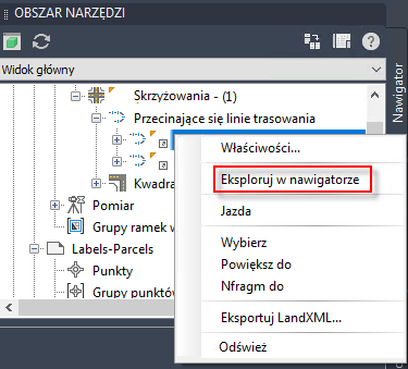 Innym elementem dostępnym w kolekcji Przecinające się linie trasowania jest polecenie Eksploruj w nawigatorze.