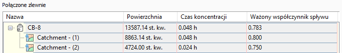 Wyświetla powierzchnię każdej zlewni i całkowity obszar połączonych zlewni.