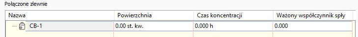 Jeśli do struktury nie są podłączone żadne zlewnie, można wprowadzić wartości zlewni bezpośrednio w polach Powierzchnia, Czas koncentracji i Ważony współczynnik spływu.