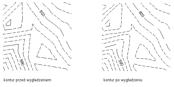 Efektem operacji wygładzania powierzchni są płynnie przebiegające warstwice, które nie nakładają się na inne warstwice.