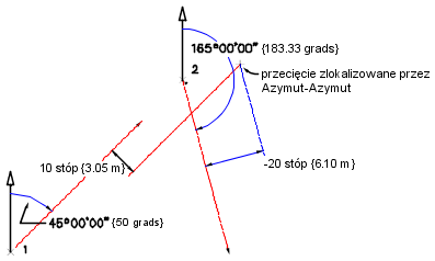 Punkt przecięcia znajduje się pomiędzy azymutem 50.000 rysowanym z punktu 1, przy odległości odsunięcia 10 w prawo, a azymutem 183.3333 rysowanym od punktu 2, przy odległości odsunięcia 20 w lewo.