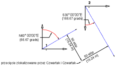 Punkt przecięcia znajduje się pomiędzy czwartakiem N66.6667"E rysowanym z punktu 1, przy odległości odsunięcia 50 stóp w prawo, a czwartakiem S33.3333"E rysowanym od punktu 2, przy odległości odsunięcia 50 w prawo.