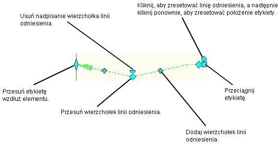 uchwyty. Za pomocą tych uchwytów można utworzyć dodatkowe wierzchołki. Uwaga: Jeśli typ linii odniesienia w stylu etykiety w stanie po przeciągnięciu został ustawiony na wartość splajn, przez wszystkie punkty wierzchołków wykonane zostanie dopasowanie splajnu programu AutoCAD.