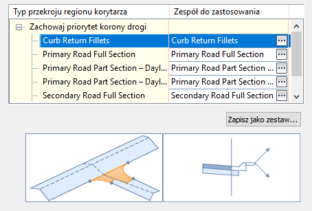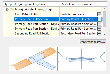 Ilustracje schematyczne w oknach dialogowych: przy każdym wybraniu właściwości lub elementu do edycji w oknach dialogowych edycji skrzyżowania ilustracje schematyczne wyświetlane w dolnej części okna dialogowego edycji zostaną zaktualizowane, wskazując położenie w przekroju, na które miała wpływ edycja.
