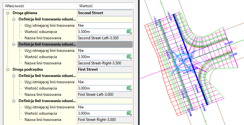 Linia trasowania odsunięcia po prawej stronie jest wybrana w oknie dialogowym Parametry odsunięcia skrzyżowania pokazanym po lewej stronie. W rysunku ta linia trasowania odsunięcia jest podświetlona.