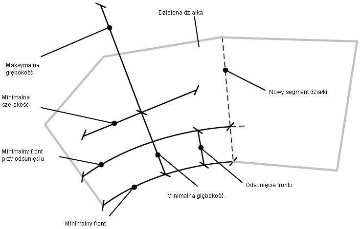 Można zdefiniować kryteria wymiarowania działki podczas tworzenia lub edycji działek przez podział istniejących działek.