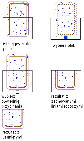 Szkic można przyciąć do mniejszej powierzchni, używając obwiedni definiowanej przez użytkownika. Można przycinać kreskowania, linie, polilinie, łuki, okręgi lub bloki. Ani szkic do przycięcia, ani szkic definiujący nową obwiednię nie muszą mieć obwiedni zamkniętych. Przykładowo, można użyć polilinii do przycięcia okręgu i okręgu lub okręgu do przycięcia polilinii.