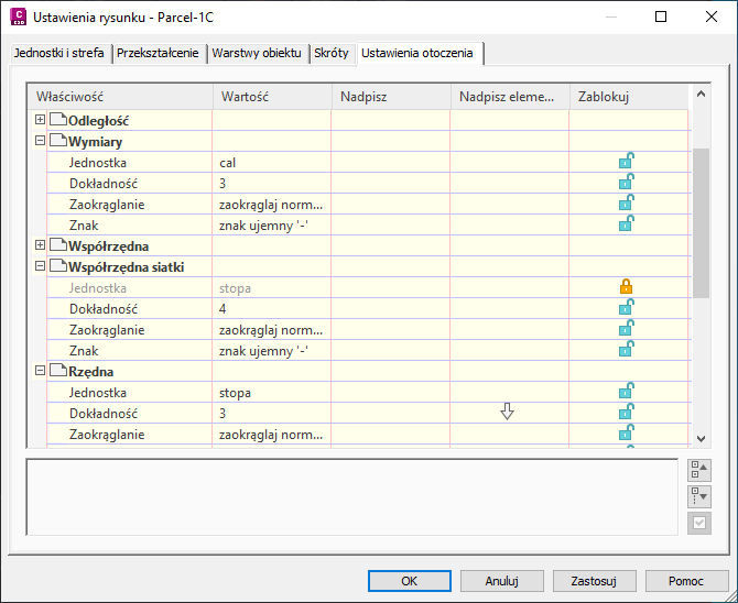 Ustawienia otoczenia skonfigurowane na poziomie rysunku są dostępne na poziomie elementów na liście i można je tam korygować.
