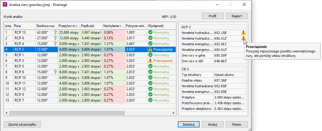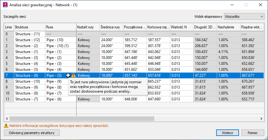 Po wybraniu wiersza w tabeli wyników w prawym panelu są wyświetlane szczegółowe informacje o rurze i strukturze w wybranej linii.