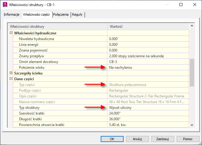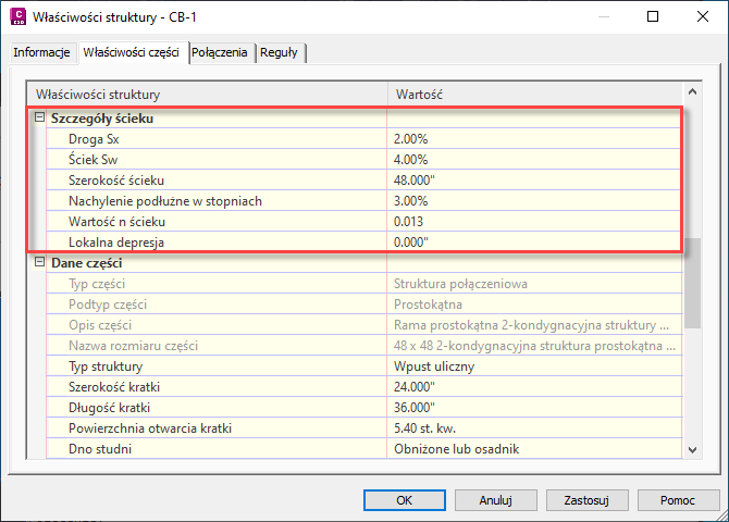 Można użyć sekcji Szczegóły ścieku w oknie dialogowym Właściwości struktury, aby określić właściwości obszaru jezdni wokół wlotu. Właściwości te są używane przez polecenie Analizuj sieć grawitacyjną do obliczeń analizy wlotów.