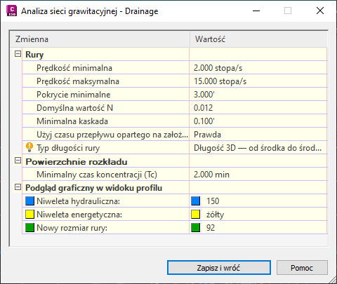 Polecenie Analizuj sieć grawitacyjną umożliwia zmianę średnicy rur i zresetowanie den rur oraz wykonywanie obliczeń niwelet hydraulicznych i energetycznych zgodnie z normami HEC-22.