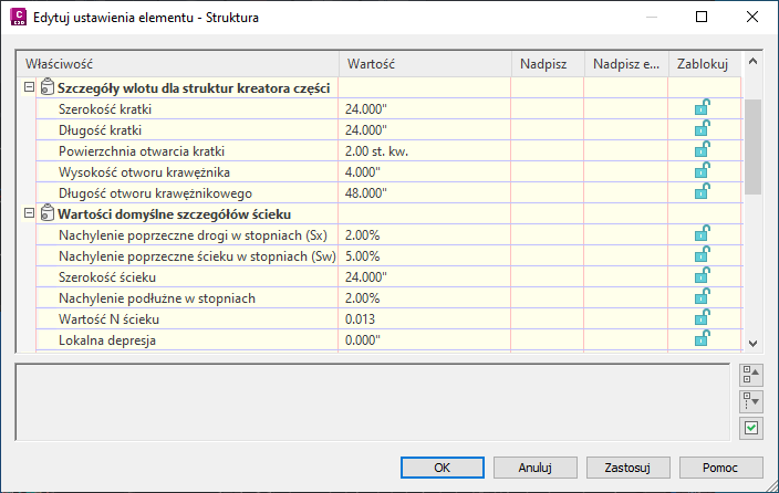 Domyślne ustawienia struktur można określić w oknie dialogowym Edytuj ustawienia elementu — Struktura.
