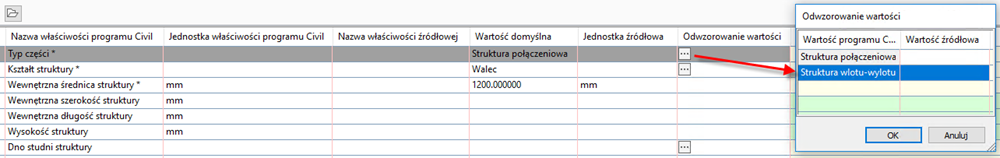 Poniższy przykład ilustruje, w jaki sposób skorzystać z okna dialogowego Odwzorowanie wartości w celu odwzorowania wartości źródłowych atrybutu „Structure_type”, tak aby zostały one przeniesione do programu Civil 3D jako struktury Połączenie.