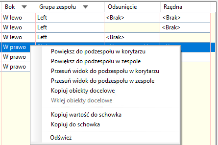 Polecenia z menu kontekstowego służą do kopiowania obiektów docelowych z jednego podzespołu i wklejania ich do co najmniej jednego innego podzespołu oraz powiększania i przesuwania widoku do podzespołów.