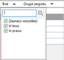 Kliknij nagłówek kolumny, aby wyświetlić pole wyszukiwania i pola wyboru, których można użyć do określenia kryteriów filtrowania.