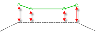 Poniższa ilustracja przedstawia linię charakterystyczną w kolorze zielonym, którą narysowano zgodnie z rzędnymi powierzchni (pokazanymi jako linia przerywana w kolorze szarym) przy dodatniej wartości odsunięcia rzędnych. Ta linia charakterystyczna została utworzona w taki sposób, że jest względna do powierzchni.