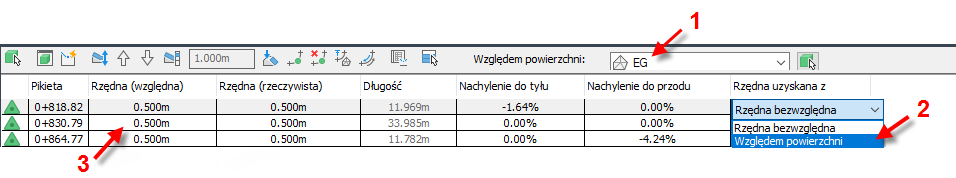 W przypadku linii charakterystycznej, które nie została wcześniej ustawiona jako względna do powierzchni, gdy otworzysz Edytor rzędnej skarpy, a następnie wybierzesz powierzchnię z listy Względem powierzchni, kolumna Rzędna uzyskana z zostanie początkowo ustawiona na wartość Rzędna bezwzględna dla wszystkich punktów i nie będzie się zmieniać automatycznie na wartość Względem powierzchni. Użyj listy rozwijanej, aby wybrać wartość Względem powierzchni dla punktów, które mają być względne.