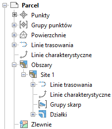 Aby wyświetlić lub zmodyfikować właściwości działki, należy kliknąć kartę Nawigator w oknie Obszar narzędzi, a następnie kliknąć działkę prawym przyciskiem myszy i wybrać polecenie . Na poniższym rysunku przedstawione są dwie działki: OPEN SPACE 100 i OPEN SPACE 101: