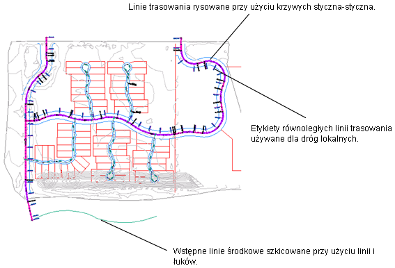 Linie trasowania są tworzone jako kombinacje linii, łuków i krzywych przejściowych, które są wyświetlane jako jeden obiekt.