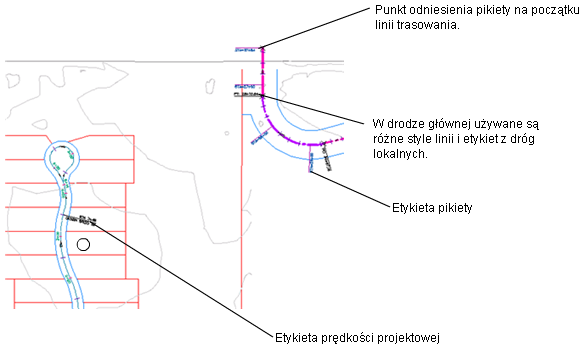 Do sterowania wizualnym wyglądem komponentów i etykiet linii trasowania służą style. Można tworzyć odrębne style przeznaczone do używania w różnych fazach projektu. Podczas tworzenia linii trasowania należy określić styl obiektu linii trasowania oraz style etykiet linii trasowania. Korzystając z okna dialogowego Etykiety linii trasowania, można utworzyć grupy stylów etykiet linii trasowania, a następnie zapisać te etykiety w zestawie i używać do innych linii trasowania.
