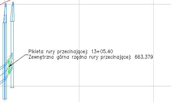 Jeśli przecinająca rura zostanie przeniesiona do innej pikiety wzdłuż linii trasowania, etykiety zostaną zaktualizowane o nowe informacje o pikiecie i rzędnej.