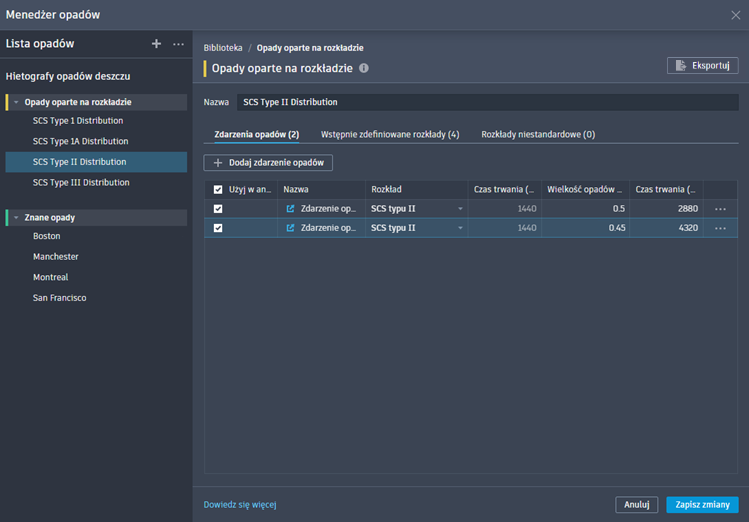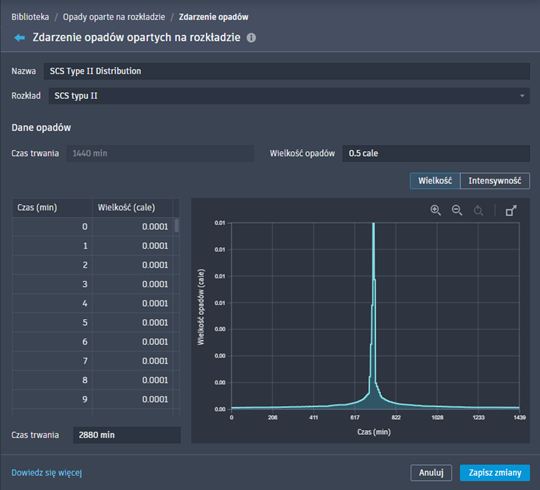 - (Opcjonalnie) Dostosuj czas do rozkładu opadów. Wartość domyślna to dwukrotność wstępnie skonfigurowanego czasu trwania.