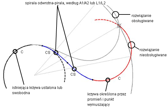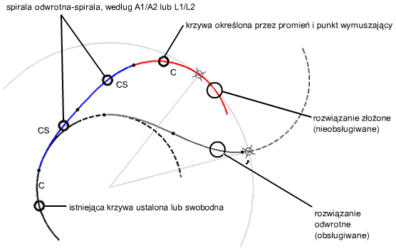 Swobodne łuki odwrotne z krzywą przejściową są przydatne, gdy wymagane są dwie symetryczne krzywe odwrotne, a geometria łuku powinna zawsze przechodzić przez wyznaczony punkt.