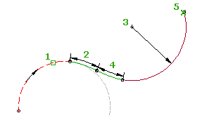 Dwie krzywe przejściowe wyginają się w przeciwnych kierunkach. Łuk wygina się z przeciwnym kierunku w stosunku do łuku dołączenia. W przypadku edycji łuku dołączenia (1), długości krzywych przejściowych (2, 3) i punkty wymuszające (4, 5) nie zmieniają się. Punkt dołączenia, promień i długość łuku odwrotnego zmieniają się, aby dostosować się do edycji łuku dołączenia.