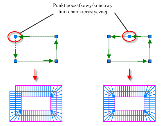 Aby obejść ten problem, zaleca się narysować linię charakterystyczną tak, aby zaczynała się i kończyła w innym położeniu niż narożnik, jak pokazano na następnej ilustracji po prawej stronie.
