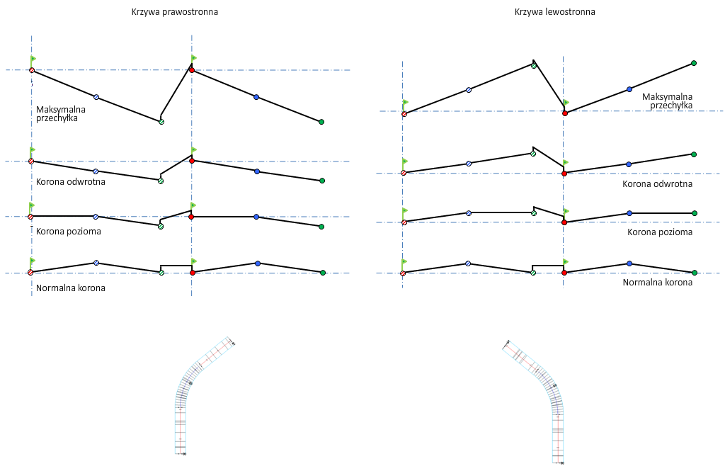 Zniekształcony pas rozdzielający oznacza, że po zastosowaniu przechyłki szerokość pasa pozostaje taka sama, ale boki są podnoszone lub obniżane w celu dopasowania przechyłki. Ta opcja spowoduje zniekształcenie pasa rozdzielającego, a
