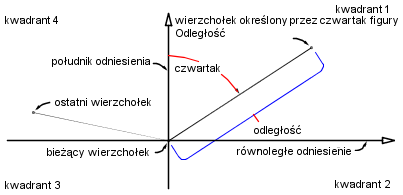 Możliwe jest utworzenie nowego wierzchołka poprzez wskazanie kierunku względem bieżącego wierzchołka figury. Aby to polecenie działało prawidłowo, figura musi mieć już co najmniej jeden wierzchołek.