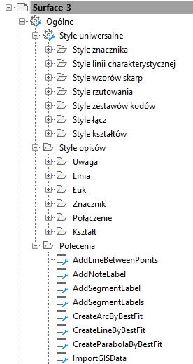 Obiekty Rury i Powierzchnia współużytkują te same style renderingu w grupie Style uniwersalne, natomiast Korytarze i Profilowanie współużytkują inne style z tego samego folderu.