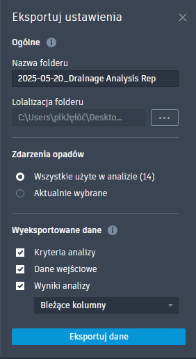 - W obszarze Zdarzenia opadów wybierz, które opady mają być eksportowane z danymi analizy. Każde zdarzenie spowoduje utworzenie nowego pliku *xlsx.