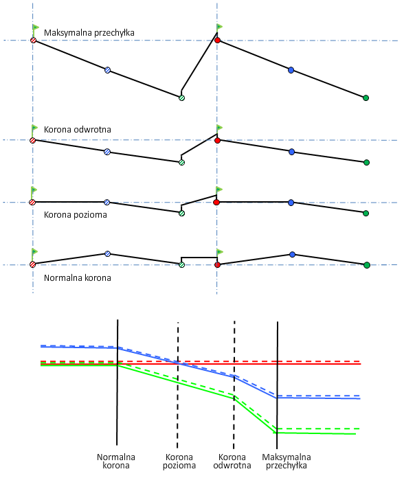 Zniekształcony pas rozdzielający oznacza, że po zastosowaniu przechyłki szerokość pasa pozostaje taka sama, ale boki są podnoszone lub obniżane w celu dopasowania przechyłki. Ta opcja spowoduje zniekształcenie pasa rozdzielającego, a