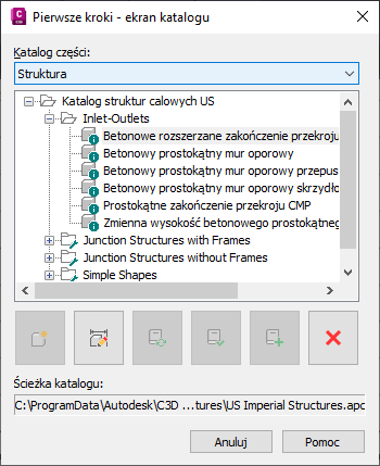 W oknie dialogowym można wybrać do dalszej pracy katalog rur albo katalog struktur i nawigować po kategoriach w ramach wybranego katalogu.