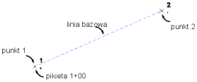 Linia bazowa biegnie od punktu 1 do 2. Punkt 1 określony jest jako pikieta 1+00. Kierunek i odległości wyrażone są w bieżących jednostkach, chyba że określony został przyrostek kwalifikacyjny.
