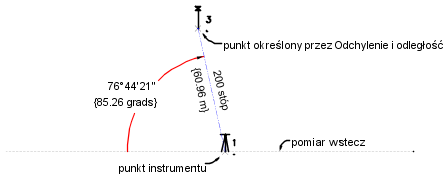 Punkt 3 został utworzony przez obrót kąta odchylenia o 85.2657 w prawo od przedłużenia linii pomiaru wstecz przy odległości wynoszącej 200. Kąty i odległości wyrażone są w bieżących jednostkach, chyba że określony został przyrostek kwalifikacyjny.