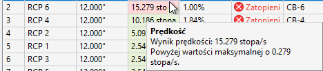 Jeśli prędkość jest niższa od prędkości minimalnej lub wyższa od prędkości maksymalnej określonej w oknie Ustawienia, kolumna ta jest zacieniona na czerwono. Po umieszczeniu wskaźnika nad komórką wyświetlana jest etykieta narzędzia pokazująca, o ile prędkość jest niższa od minimalnej lub wyższa od maksymalnej.