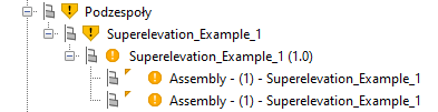 Gdy ścieżka do pliku PKT podzespołu wymaga aktualizacji, na elementach w drzewie Nawigatora zostaną wyświetlone ostrzegawcze symbole i etykiety narzędzi.