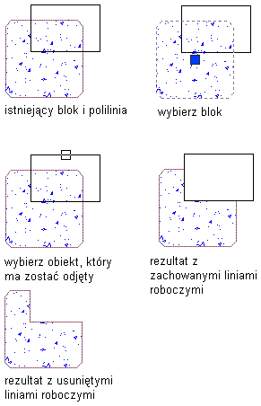 Od szkicu lub bloku zawierającego szkic można odjąć określoną część bez przerysowywania pozostałych komponentów. Część do odjęcia może zawierać linie, polilinie (zamknięte lub otwarte), łuki, okręgi, tekst lub kreskowania lub być przedstawiana przez nie. Jeśli odejmowanie usuwa część zamkniętej polilinii, jest ona odtwarzana jako zamknięta. Jeśli odejmowanie przecina zamkniętą polilinię, obie części są odtwarzane jako oddzielne, zamknięte polilinie. Kiedy jednak odejmowanie przecina kreskowanie, pozostaje ono pojedynczym elementem szkicu, który można wybrać przez kliknięcie dowolnej części.