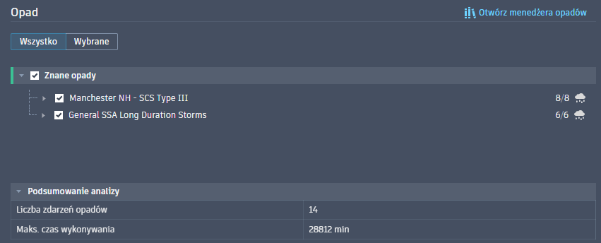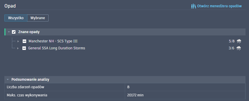 Liczniki po prawej stronie zestawów opadów przedstawiają całkowitą liczbę zdarzeń wybranych zdarzeń z możliwej liczby zdarzeń w zestawie. W sekcji Podsumowanie analizy na dole wyświetlana jest całkowita liczbę opadów zastosowanych do systemu drenażu i największy określony maksymalny czas segmentu zdarzeń.